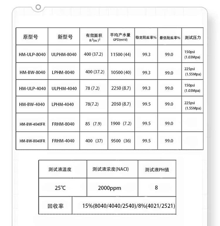 BW 系列BW系列是华膜公司研制开发的用于苦咸水脱盐的芳香族聚酷胺复合膜元件,具有运行压力低、产水量高、脱盐率高的特点。对溶解性盐类、TOC、Si02等物质具有很高的去除率,特别适用电子、电力行业高纯水的制备。